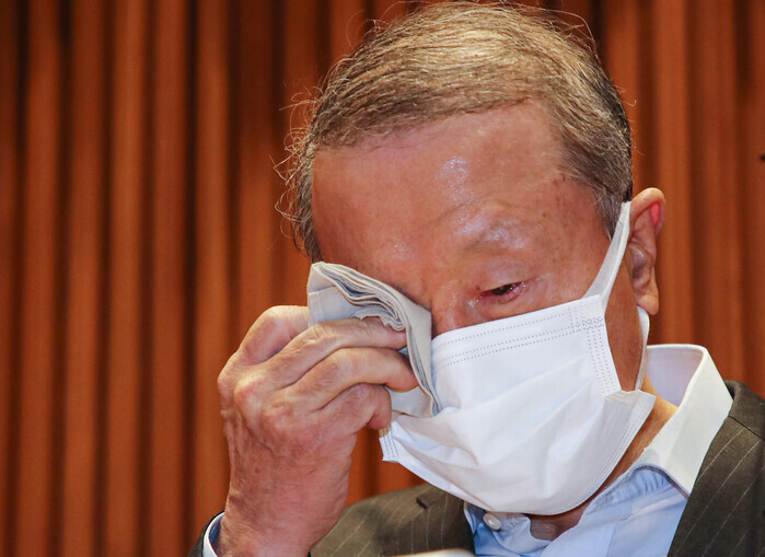 ▲홍원식 남양유업 회장이 4일 오전 서울 강남구 남양유업 본사에서 대국민 사과를 하던 도중 눈물을 흘리고 있다. [사진=연합뉴스] |