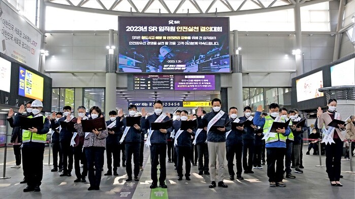 이날 결의대회는 에스알 이종국 대표이사와 김상수 노조위원장이 참석한 가운데 협력사, 수서동 지역주민과 함께 수서역 맞이방에서 안전실천 결의문을 낭독하며 고객들에게 안전최우선 경영 실천에 앞장서겠다고 다짐했다.