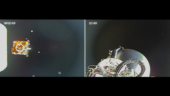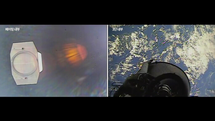 ▲ 누리호에 달려있던 카메라에 찍힌 페어링 분리 영상 캡처 화면. [한국항공우주연구원 제공] |