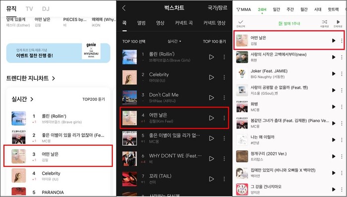 김필의 ‘어떤 날은’은 지난 3일 오후 6시 공개 직후 순위권에 진입했으며, 다음날 오후 2시 기준 지니뮤직 실시간 차트에서 3위를 기록했다. 벅스 실시간 차트에서도 4위에 올라 김필의 저력을 입증했다.