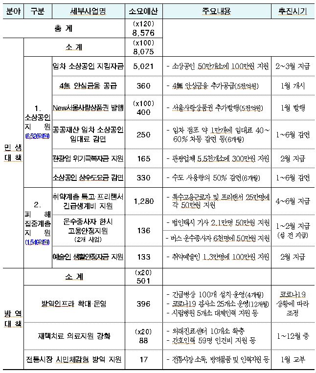 ▲ 소상공인 지원에 6526억 원, ▲ 피해 집중계층 지원에 1549억 원, ▲ 방역인프라 확충에 501억 원 등 3개 분야 총 16개 세부사업에 집중 투자한다. 설 연휴 전부터 순차적으로 지원이 시작될 수 있도록 추진한다.