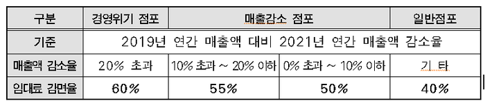 아울러, 지난해 하반기에 한시적으로 시행했던 소상공인 수도요금 감면을 6개월 연장해 수도 사용량의 50%를 깎아주고, 지하철‧지하도상가 등 시 공공상가에 입점한 총 1만1개의 소기업‧소상공인 점포에게는 매출 감소율에 따라 최대 60%까지 임대료를 줄여준다.