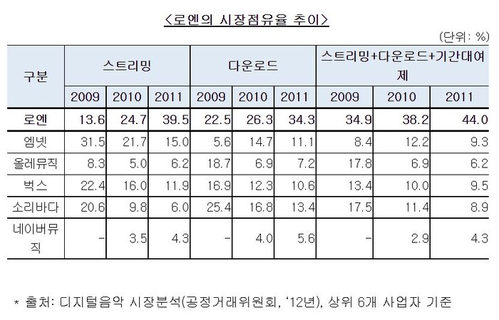 로엔은 같은 기간 단 한 번도 1위 사업자 지위를 내준 적이 없지만, 2위와 시장점유율 격차가 2009년 17%포인트에서 2010년 26%포인트, 2011년에는 35%포인트로 크게 벌어진 것으로 확인됐다.