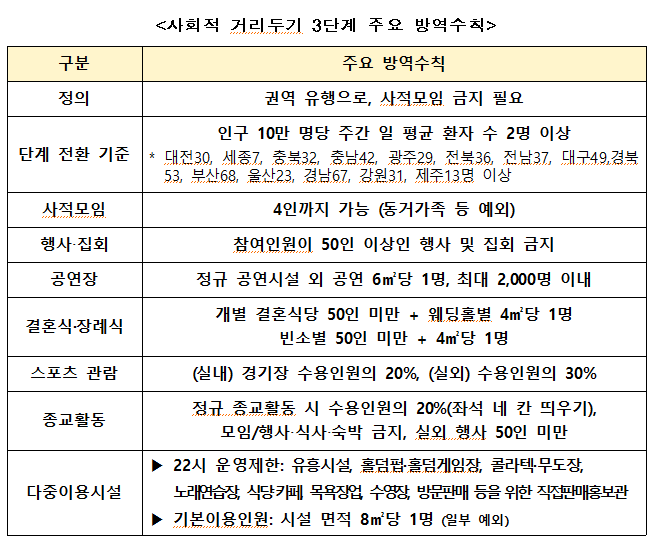▲ 사회적 거리두기 3단계 주요 방역수칙. [출처=중앙재난안전대책본부] |