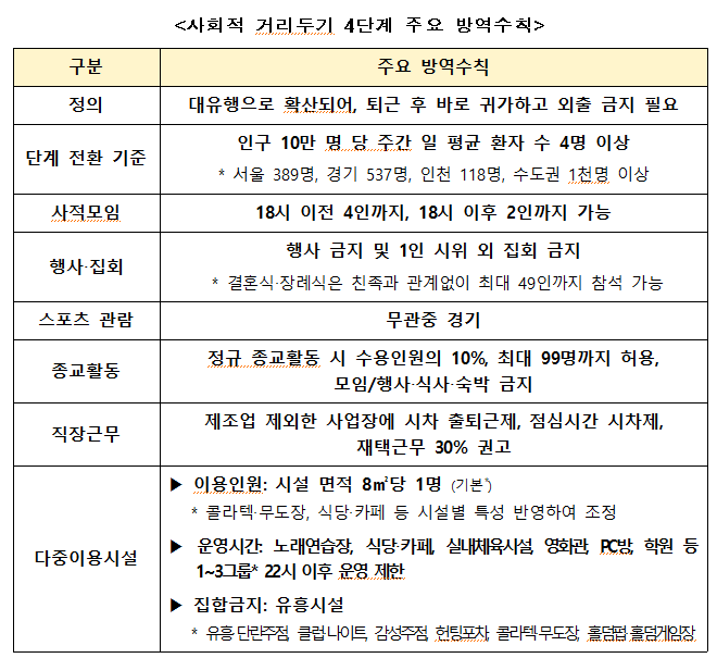 이에 따라 스포츠 영업시설과 예방접종 완료자에 한시적으로 적용 중인 수칙을 정규 수칙화하여 4단계에서는 사적모임의 예외를 인정하지 않기로 했다.