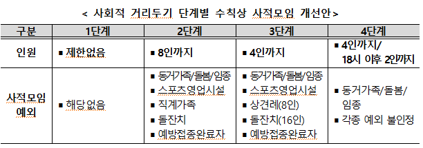 ▲ 사회적 거리두기 단계별 수칙상 사적모임 개선안. [출처=중앙재난안전대책본부] |