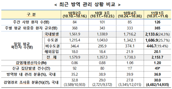 8일 코로나19 중앙재난안전대책본부(중대본)에 따르면, 지난 한 주(10.31~11.6) 국내 발생 확진자 수는 1만4935명으로, 하루 평균 2133.6명으로 집계됐다. 그 전 주간(10.24~10.30)의 1716.2명에 비해 417.4명(24.3%)이 증가했다.