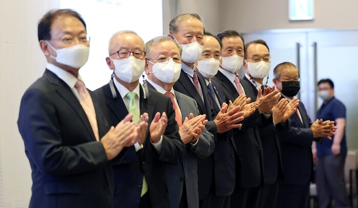 | ▲ 9일 오후 서울 영등포구 전국경제인연합회(전경련) 회관에서 열린 역대 기획재정부 장관 초청 특별대담 '새 정부에 바라는 경제정책 방향'에서 역대 장관들이 기념촬영을 하고 있다. 왼쪽부터 유일호, 현오석, 강만수, 허창수, 추경호 경제부총리 겸 기획재정부 장관, 윤증현, 박재완 전 기획재정부 장관, 권태신 전경련 부회장. [서울=연합뉴스] |