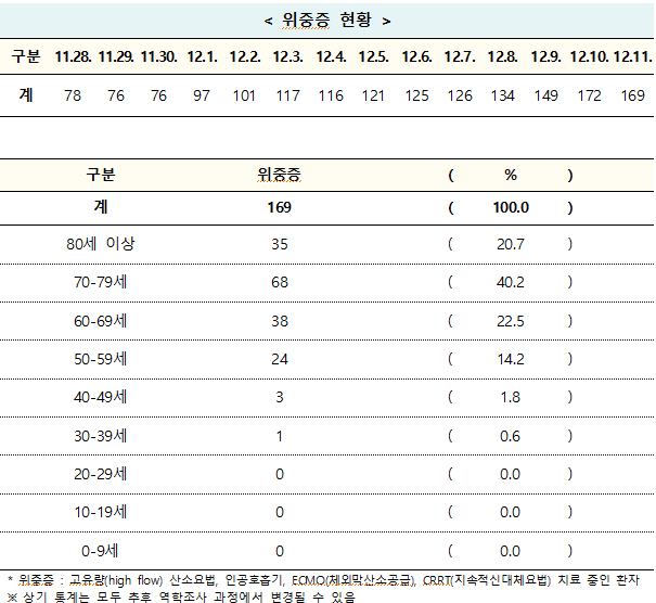위중증 환자는 전날보다 3명이 줄어든 169명이었다. 비록 전날보다는 줄었지만 이달 들어 11일동안 배가 훨씬 넘는 93명이나 급증했다.