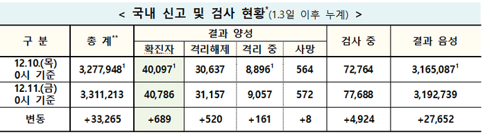 중앙방역대책본부(방대본)는 11일 0시 기준으로 전날 대비 코로나19 신규 확진자가 689명 추가돼 지금까지 누적 확진자는 4만786명(해외유입 4842명)으로 집계됐다고 밝혔다.
