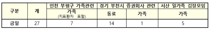 인천에서도 부평구 일가족·증권회사와 관련해 지난 6일 첫 확진자 발생 이후 접촉자 조사 중 26명이 추가 확진돼 누적 27명으로 늘었다.