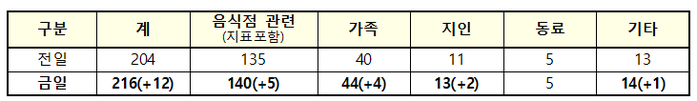 서울의 경우는 종로구 음식점·노래교실 관련(12명 추가, 누적 216명), 은평구 소재 역사 관련(9명 추가, 누적 10명) 등에서 감염자가 이어졌다.