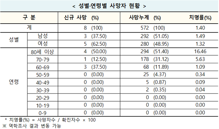 사망자는 이틀 연속 8명이 늘어 누적 572명이 됐다. 평균 치명률은 1.40%를 기록했다. 사망자는 지난 3일(3명)부터 9일째 이어졌고, 이 기간 동안 모두 46명이 목숨을 잃었다.