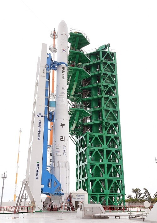 누리호를 실은 트랜스포터(transpoter)는 시속 1.5㎞로 천천히 이동해 오전 8시 44분께 전남 고흥군 나로우주센터 내 발사대에 도착했다. 이어 기립 장치인 이렉터(erector)의 도움을 받아 발사패드에 수직으로 세워진 뒤 발사대에 고정됐다.