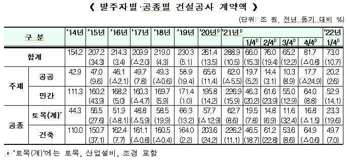 국가와 지방자치단체 등이 발주하는 공공공사는 20조2천억원으로 1년 전 같은 기간에 비해 2.6% 늘었고, 민간공사는 52조9천억원을 14.1% 증가했다.