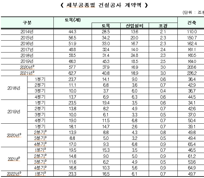 ▲ 세부공종별 건설공사 계약액. [국토교통부 제공] |