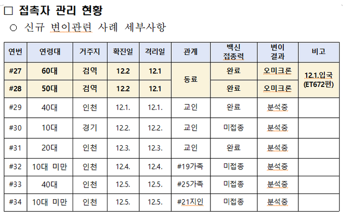 | ▲ 오미크론 신규 변이 관련 역학적 관련 세부사항. [중앙방역대책본부 제공] |