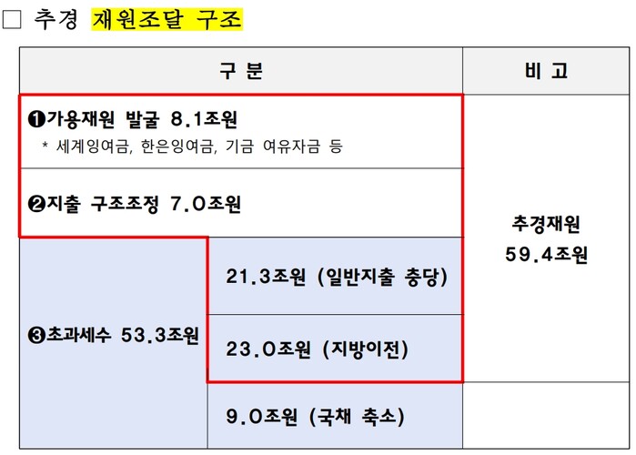 이번 추경 재원은 초과세수 53조3천억원 중 국채 상환용 9조원을 제외한 44조3천억원과, 세계잉여금·한은잉여금·기금 여유자금 등 가용재원 8조1천억원, 지출구조조정으로 마련한 7조원으로 조달한다.