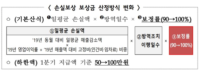 방역조치에 따른 소상공인 피해의 완전한 보상을 위해 손실보상 보정률을 기존 90%에서 100%로 상향한다. 이에 따라 손실보상 보상금 산정방식의 기본산식은 ‘일평균 손실액×방역일수×보정률(90→100%)’이 된다.