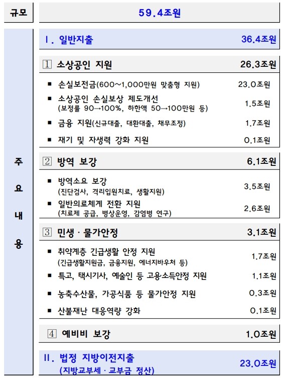 이 재원으로 소상공인과 민생 지원에 36조4천억원을, 지방재정 보강에 23조원을 투입하는 방식이다.