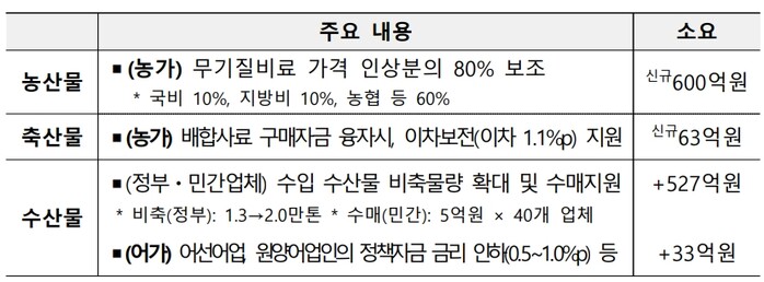 서민 장바구니 부담 완화를 위해 농축수산물 할인쿠폰(1인당 1만원·최대 20%) 지원 규모를 늘리고, 밀가루 제분업체의 가격 인상 최소화를 조건으로 가격 상승 소요의 70%를 국고로 한시 지원하는 프로그램도 가동하기로 했다.