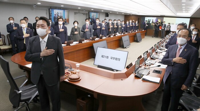 | ▲ 윤석열 대통령과 국무위원들이 12일 오후 서울 용산 대통령실 청사에서 열린 임시 국무회의에서 국기에 경례를 하고 있다. [대통령실통신사진기자단=연합뉴스] |