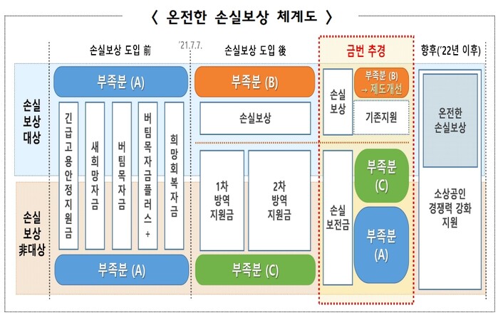 방역조치에 따른 소상공인의 누적된 피해를 온전하게 보상하기 위해 ‘손실보전금(신규) + 손실보상 제도개선’ 패키지로 지원하고, 향후 소상공인들이 외부여건 변화에도 영업을 이어나갈 수 있도록 채무부담을 줄여주고 자생력을 강화하는데 지원하게 된다.