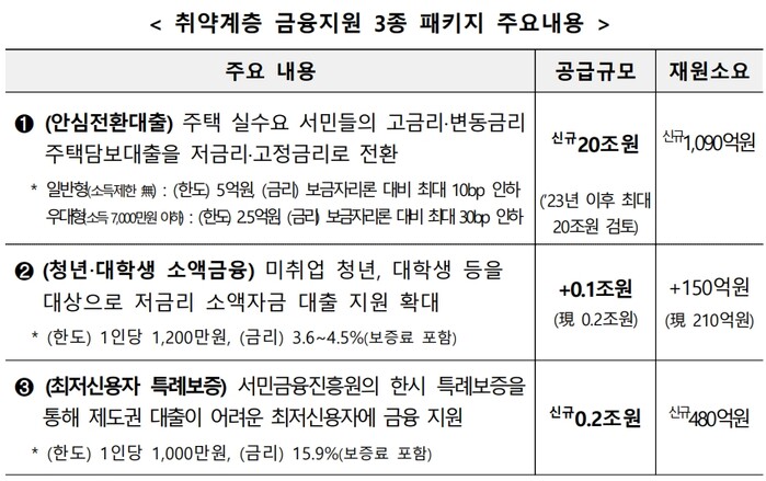 취약계층을 대상으로는 3종(안심전환대출, 청년·대학생 소액금융, 최저신용자 특례보증)의 금융지원 패키지를 가동한다.