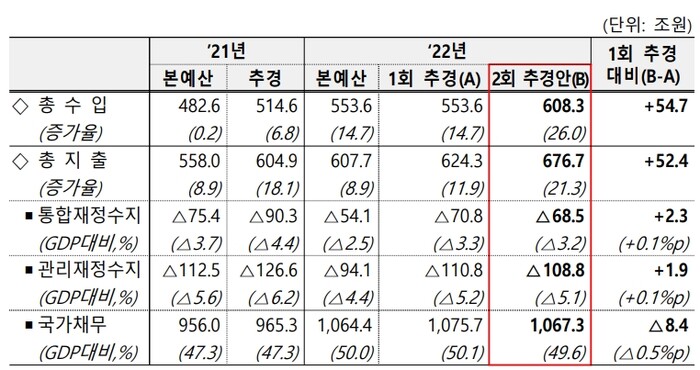 추경호 부총리 겸 기획재정부 장관은 이날 브리핑에서 “이번 추경은 추가 국채발행 없이 마련하므로 금리나 물가 등 거시경제에 미치는 영향이 최소화될 것으로 판단한다”면서 “국가채무비율도 국내총생산(GDP) 대비 50.1%에서 49.6%로 개선될 것”이라고 말했다.