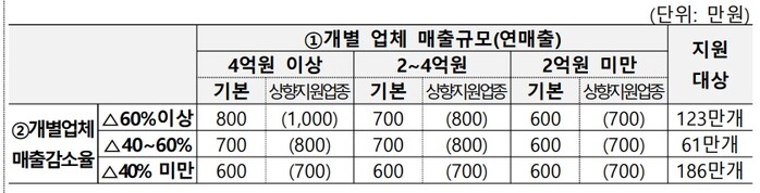 업체별 매출규모와 매출감소율 수준을 지수화·등급화해 600만~800만원의 맞춤형 지급을 하고, 업종별 특성까지 고려해 매출 40% 이상 감소 업종과 방역조치 대상 중기업에 700만~ 1000만원까지 지원할 예정이다.