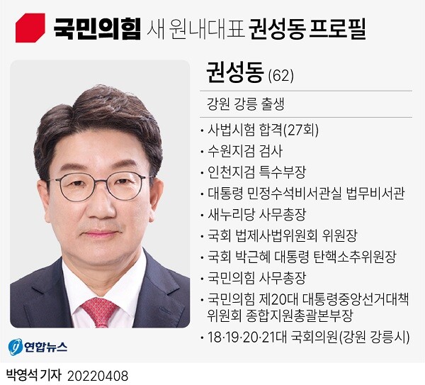 곧 집권여당이 되는 국민의힘 새 원내대표에 윤석열 대통령 당선인의 최측근인 4선의 권성동(62·강원 강릉) 의원이 선출됐다.