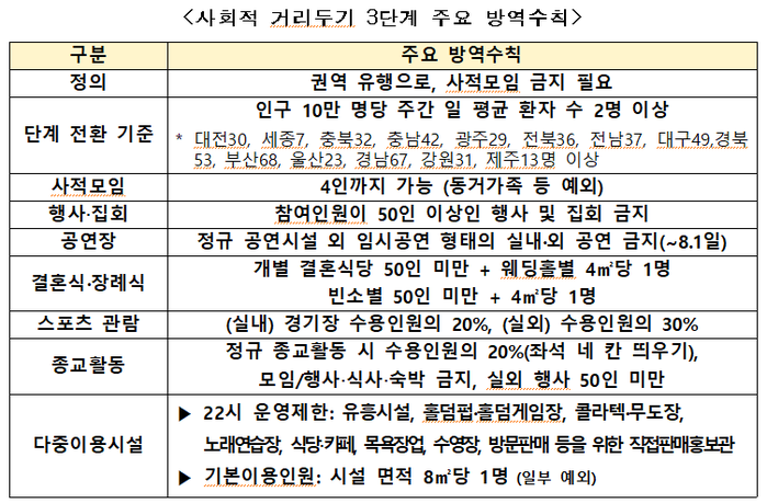 새로운 거리두기 3단계는 권역 유행이 본격화되어 모임을 금지하는 단계로서, 사적모임은 4인까지만 허용된다.
