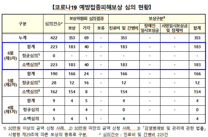 신종 코로나바이러스 감염증(코로나19) 백신 접종 후 이상반응으로 피해보상을 신청한 소액심의 대상 중 183건에 대해 보상이 결정됐다.