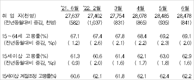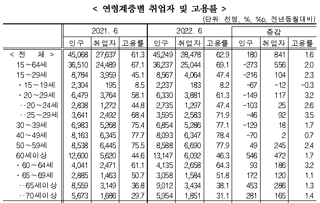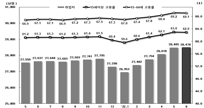 15세 이상 고용률은 62.9%로 전년 동월 대비 1.6%포인트 올랐다. 6월 기준 역대 최고치를 경신했다.