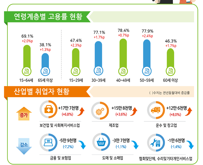 취업자를 업종별로 보면 보건·사회복지서비스업과 제조업이 각각 17만7천명과 15만8천명 증가했다. 1년 전에 비해 각각 6.8%와 3.6% 늘었다. 제조업은 8개월 연속 증가했으며, 증가폭도 커졌다.