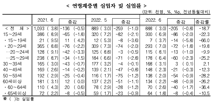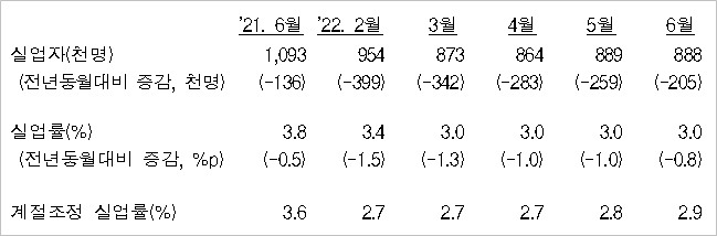 6월 실업자 수는 88만8천명으로 1년 전보다 20만5천명(-18.7%) 감소했다.
