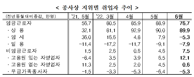 비임금근로자 중 ‘고용원 있는 자영업자’는 12만1천명, ‘고용원 없는 자영업자’는 6천명 각각 늘었으나 무급가족종사자는 5만3천명 줄었다.