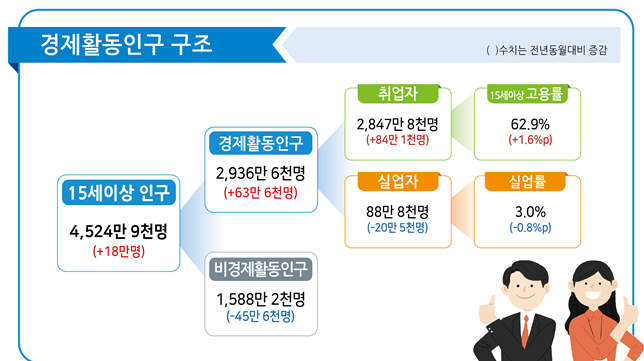 15세 이상 고용률 62.9%...실업자수 88만8천명·실업률 3.0%