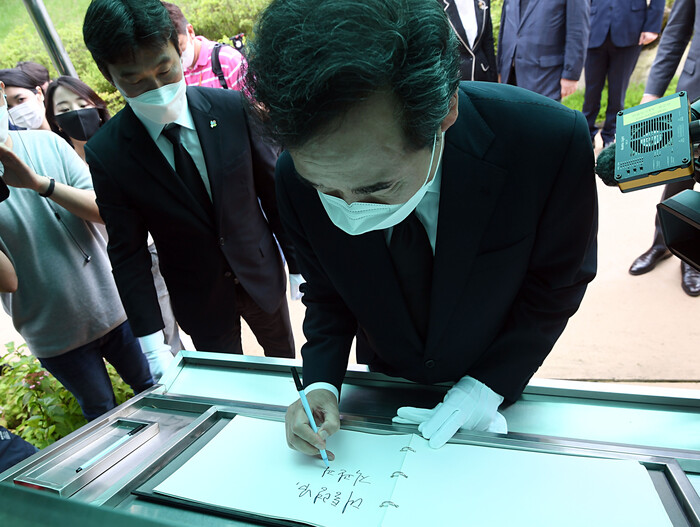 ▲ 대선 출마를 공식 선언한 더불어민주당 이낙연 전 대표가 5일 서울 동작구 국립서울현충원에서 김영삼 전 대통령의 묘역을 참배한 뒤 "대통령님, 직관과 결단을 주십시오"라고 방명록을 쓰고 있다. [국회사진기자단=연합뉴스] |