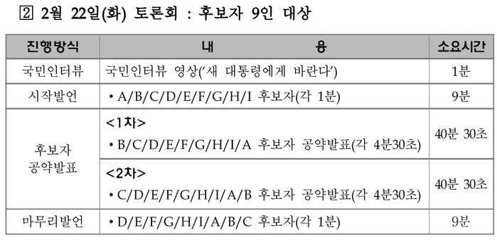 ▲ 22일 밤 11시에 열리는 '초청 외 후보자 토론회' 진행 방식. [중앙선거관리위원회 제공] |