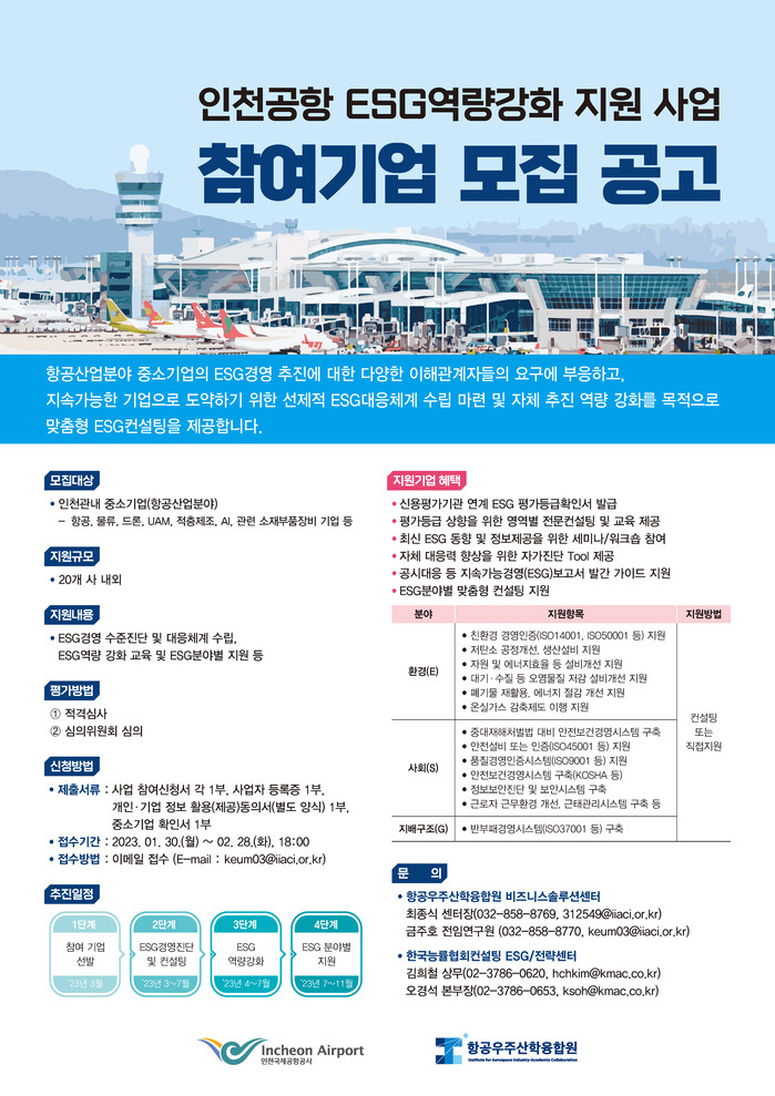 [메가경제=문기환 기자] 인천국제공항공사는 오는 2월28일까지 항공산업분야 중소기업의 ESG 경영 활성화를 위한 ‘ESG 역량강화 지원사업(ESG100)’에 참여할 중소기업을 모집한다고 지난 30일 밝혔다.