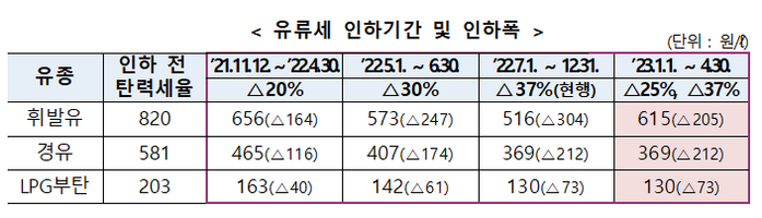 ▲ 유류세 인하기간 및 인하폭. [기획재정부 제공] |