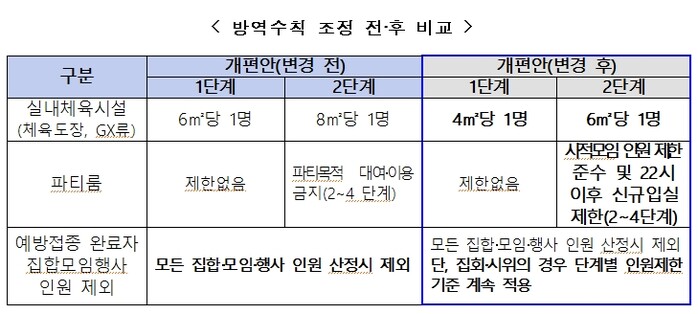 ▲ 방역수칙 조정 전후 비교. [출처=보건복지부] |