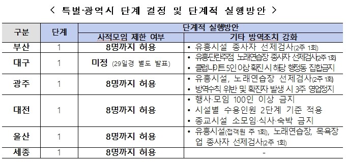 대구를 제외한 부산 대전 광주 울산 광역시와 세종 등은 2주간 8명까지만 사적 모임을 허용하고 이후 1단계 기준에 맞춰 사적 모임 제한을 해제할 예정이다.
