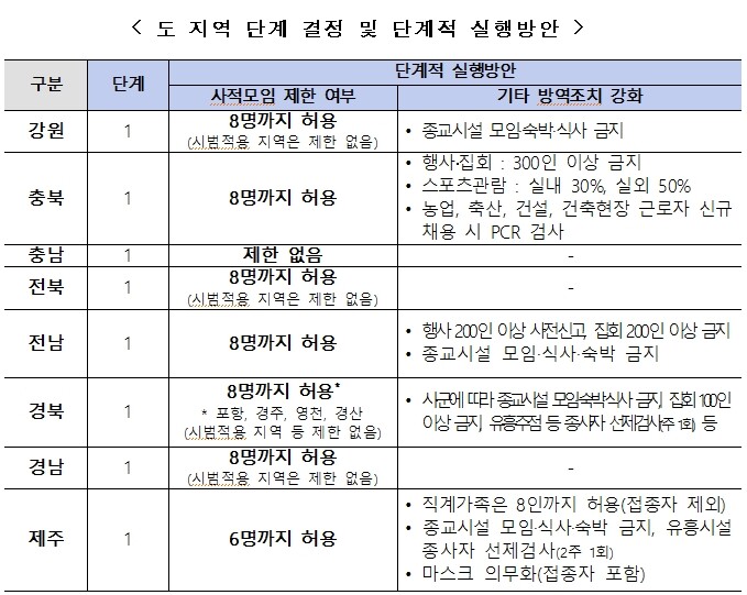 도 지역의 경우, 전남, 전북, 경남, 경북, 충북, 강원 등은 2주간 8명까지, 제주는 6명까지 사적 모임이 가능하다. 충남은 사적 모임 제한이 바로 해제된다.