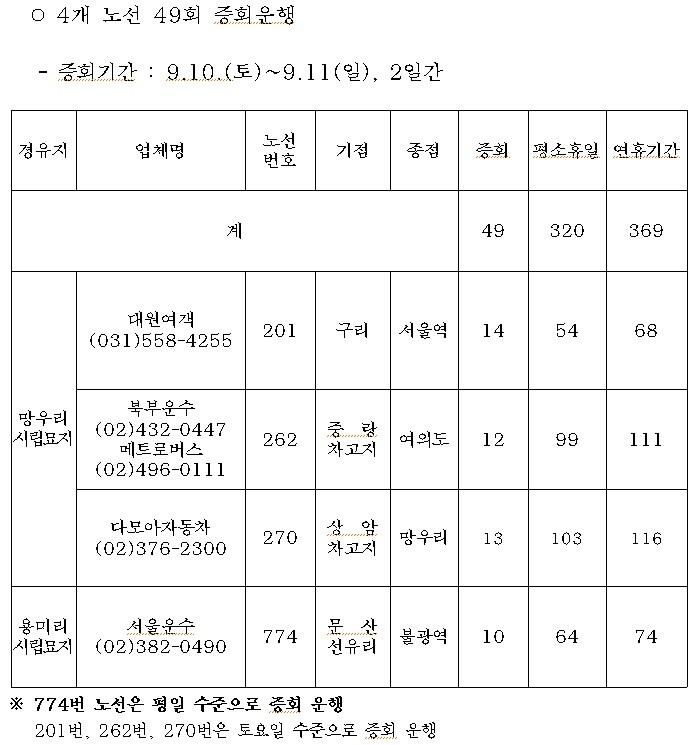 대중교통을 이용한 시립묘지 성묘객을 위해 10일과 11일 이틀간 용미리(774번), 망우리(201, 262, 270번) 시립묘지를 경유하는 4개 시내버스 노선의 운행횟수가 일일 총 49회 늘어난다.