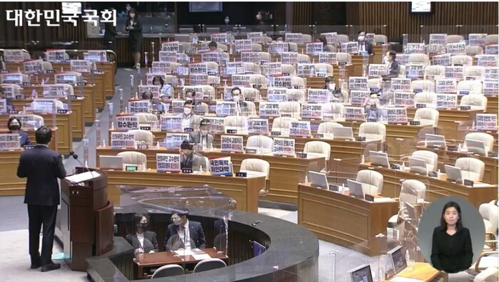 ▲ 국민의힘 권성동 원내대표가 27일 국회 본회의에서 검찰의 수사권과 기소권 분리 법안을 처리하기 전 첫번째 무제한토론(필리버스터)을 할 때 국민의힘 의원들이 자리에 앉아 있다. [국회 인터넷중계시스템 본회의 의사중계 화면 캡처] |