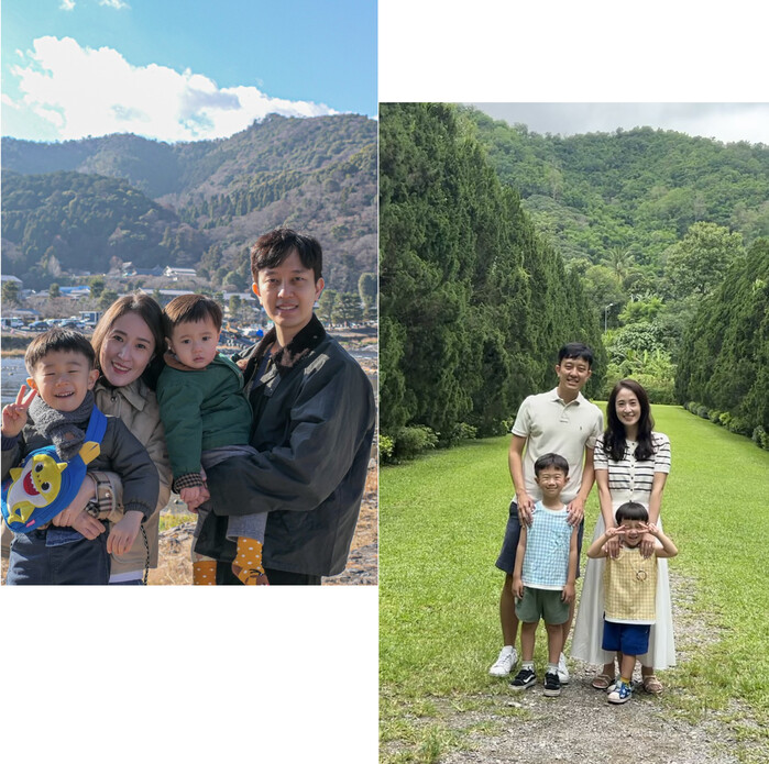 | ▲ 2020년 첫아이 하온이의 백일을 기념해 시작된 한부모가족을 위한 나눔을 6년째 이어가고 있는 윤장한·문선진 부부와 첫째 하온이, 둘째 하겸이. 가족사진 왼쪽은 2023년 12월, 오른쪽은 2025년 6월 촬영. (사진제공 : 홀트아동복지회) |