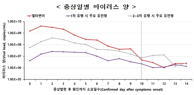 ▲ 델타 변이 바이러스와 1차, 2~3차 주요 유전형의 증상일별 바이러스 양. [질병관리청] |