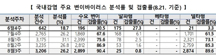 ▲ 8월 21일 기준 국내감염 주요 변이바이러스 분석률 및 검출률. [질병관리청] |